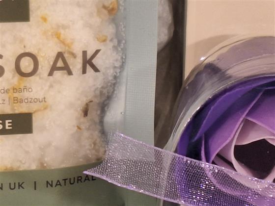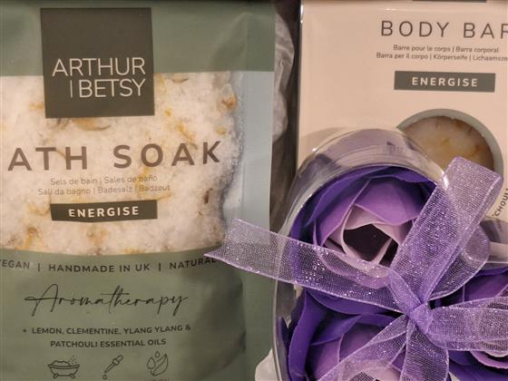 A lovely little gift box of soap flowers, bath soak salts and a gorgeous scented body bar in a reusable fabric box.
