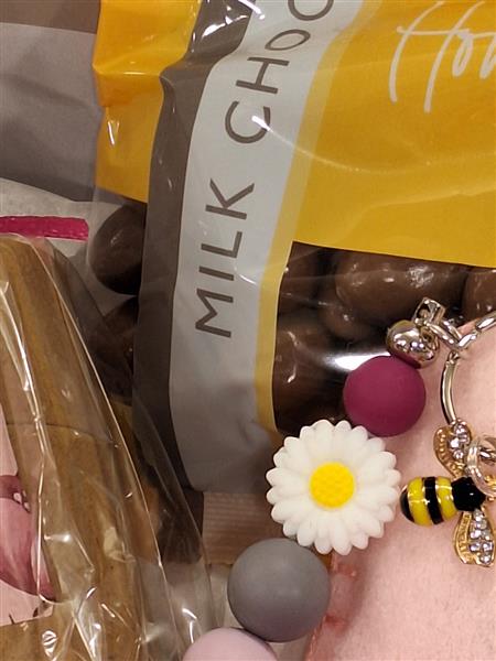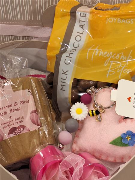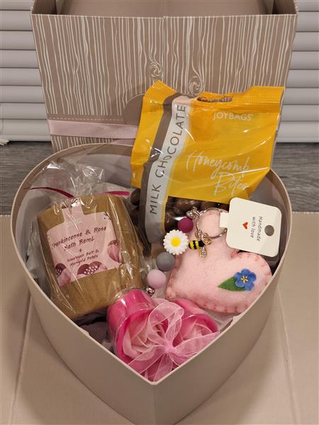 A lovely heart shaped gift box containing a bath bomb, honeycomb chocolates, soap flowers, felt heart and bee keyring.