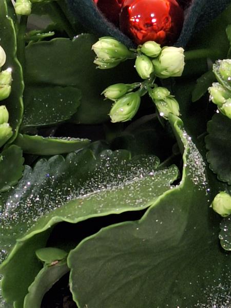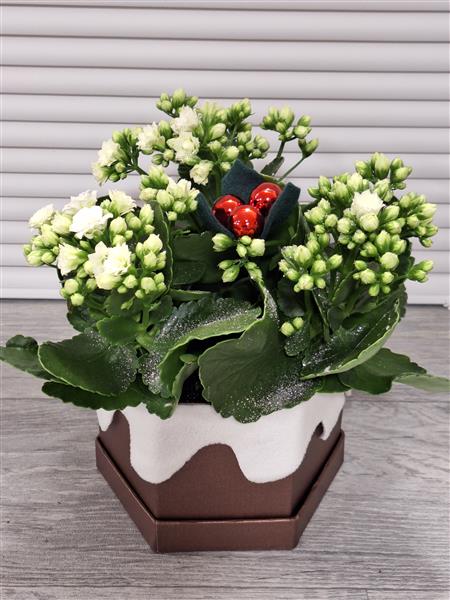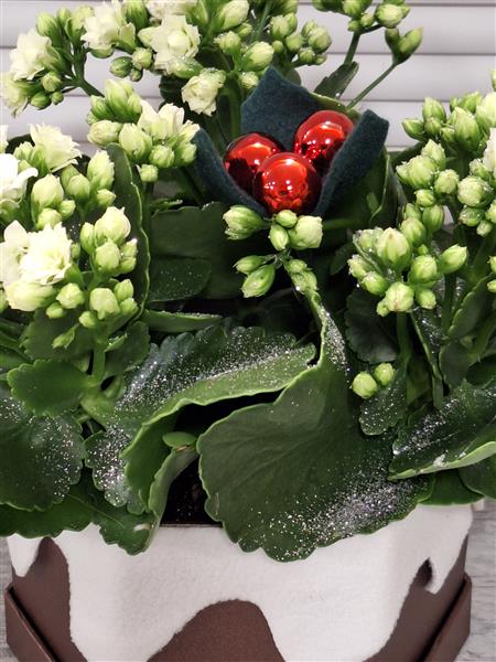A large white kalanchoe with glitter sparkles in a christmas pudding hat box finished off with glass ball holly berries and felt leaves.