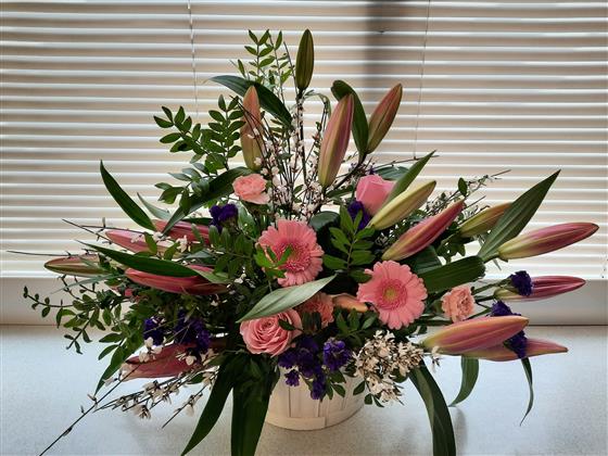 A beautiful basket arrangement with scented oriental lilies and other seasonal mixed flowers