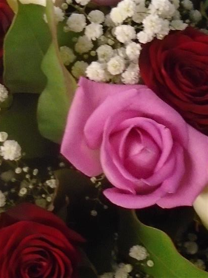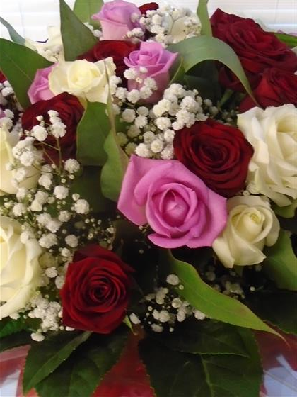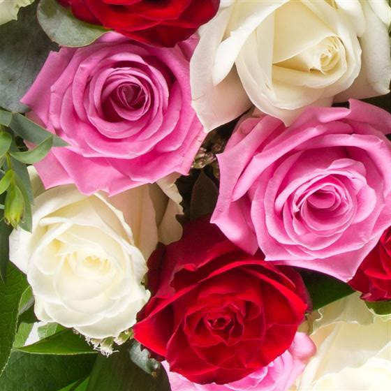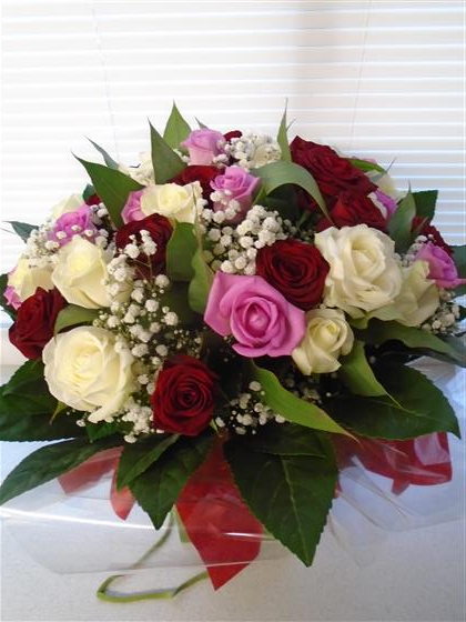 A show stopping hand-tied bouquet of 36 closely bound roses in pink, red and white.