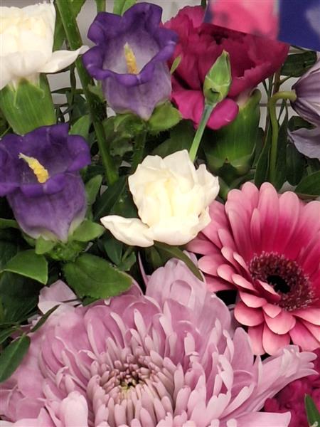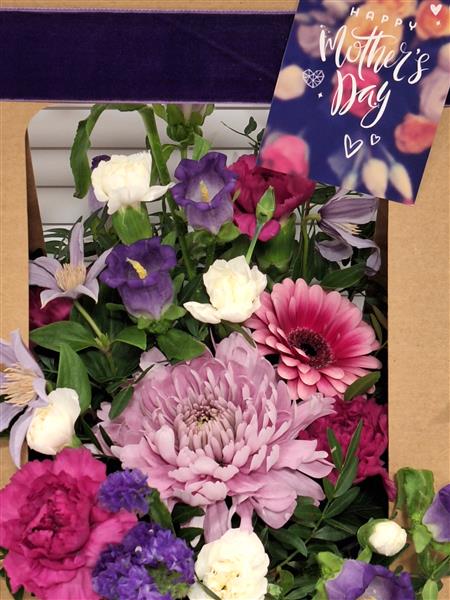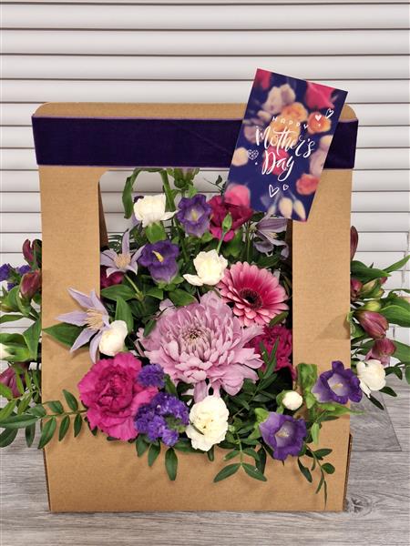 A gorgeous flower card arrangement in shades of pinks, purples and whites finished off with a velvet ribbon.