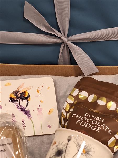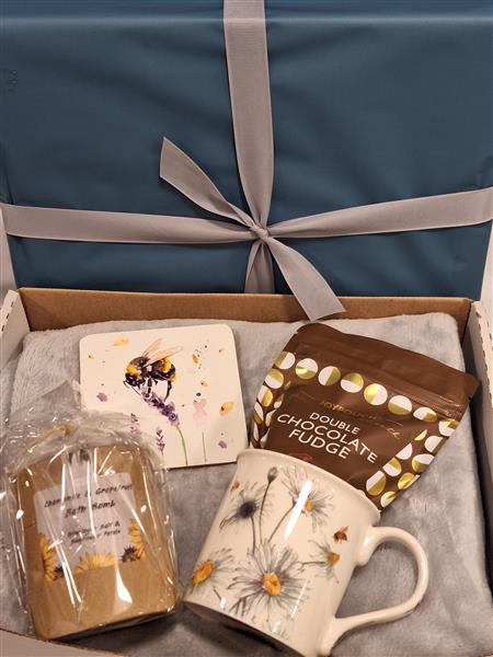 A gift wrapped box which includes a grey fleece blanket, bag of chocolates, bumble bee coaster, daisy mug and bath bomb.