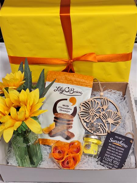 A gift wrapped box which includes a glass vase of faux sunflowers, soap flowers, a bag of pick & mix, wooden plaque, little jar of happiness and a you are my sunshine metal sign.