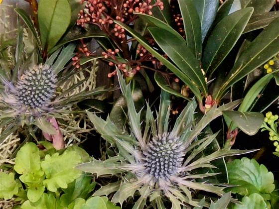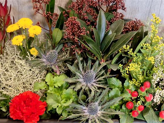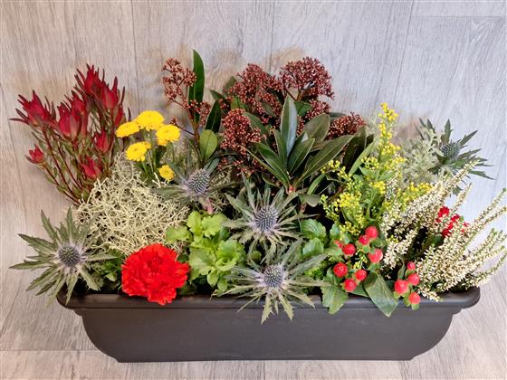 A planted trough of flowering and foliage plants finished off with some fresh flowers which can be replaced easily. This will give colour throughout the winter months.