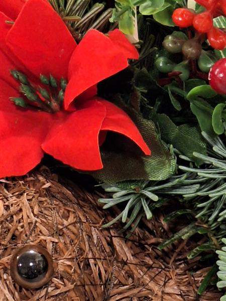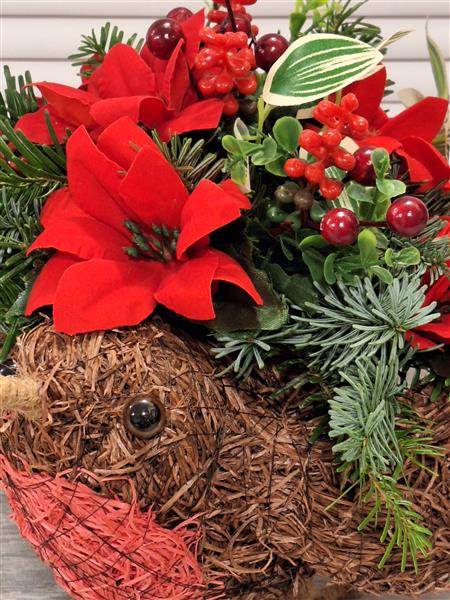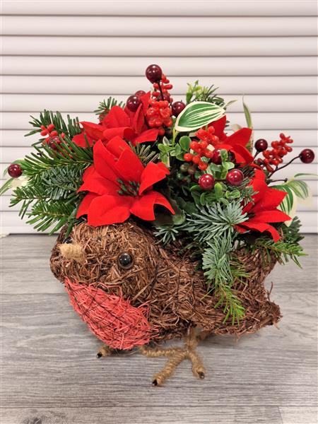 A lovely rememberance robin filled with fresh foliage finished with faux flowers and berries. Comes with a meatl peg to secure it in the ground at the graveside.