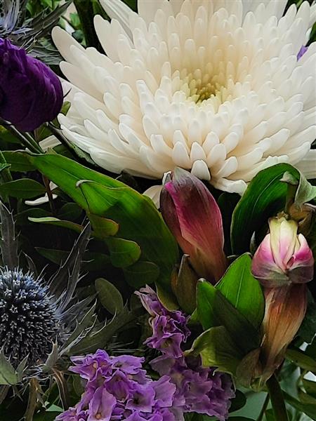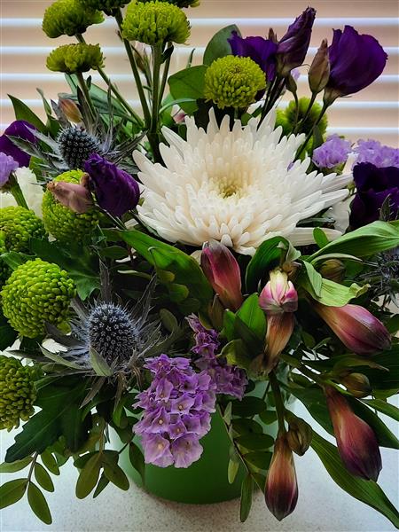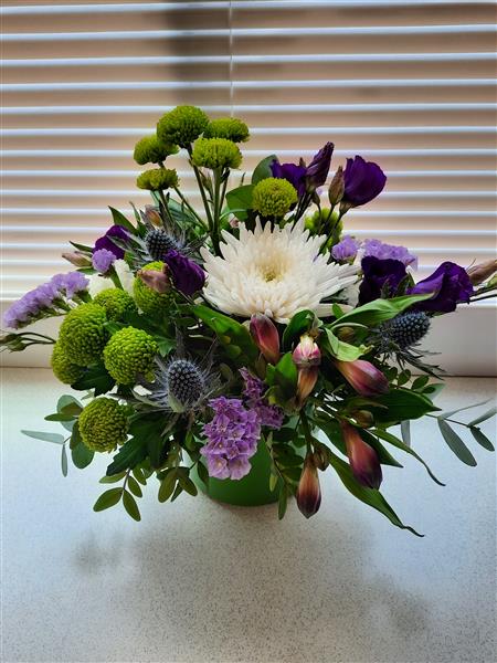 A lovely arrangement in a reusable ceramic pot flower mix includes eryngium thistles