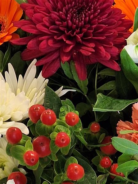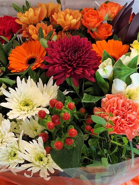 A beautiful bouquet in sunset shades is a real blaze of colour, with vivid oranges, rich reds and golden yellows.