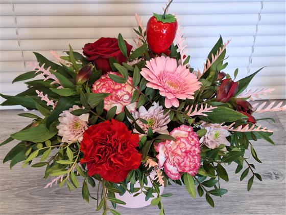 A pink ceramic pot arrangement of fresh flowers including carnations, germini, roses and alstroemeria finished off with a faux strawberry.