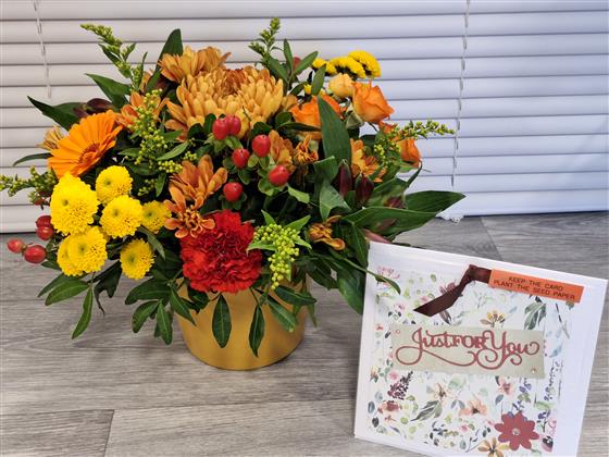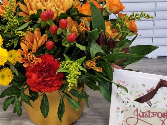 A beautiful ochre coloured ceramic pot filled with flowers including germini, alstroemeria and chrysanthemum in rich sunset colours with a handmade at caroles card with seed paper and planting instructions.