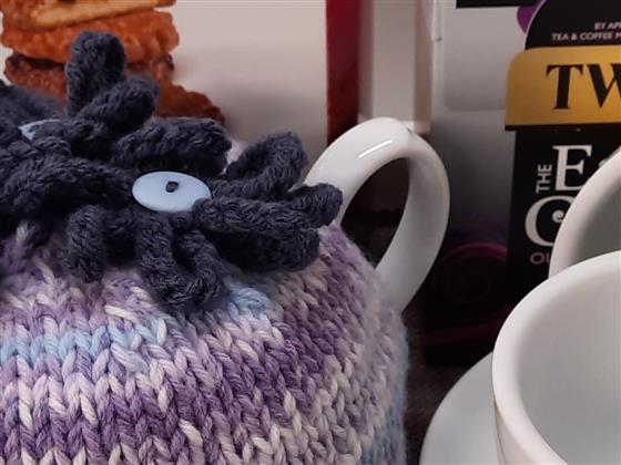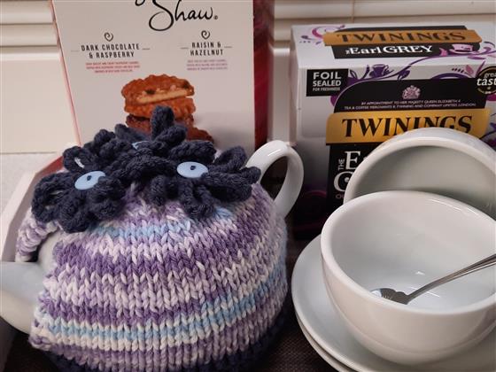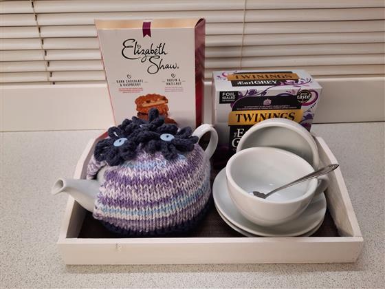 a white wooden tray with cloth complete with 2 cups with saucers, a teapot with hand made tea cosy, box of tea bags and a lovely box of biscuits, COLOURS OF TEA COSY WILL VARY DUE TO STOCK PLEASE REQUEST IF A SPECIAL COLOUR IS NEEDED