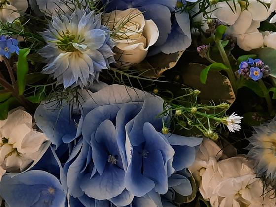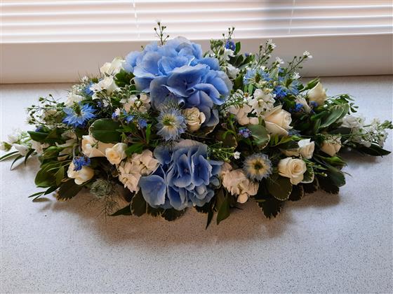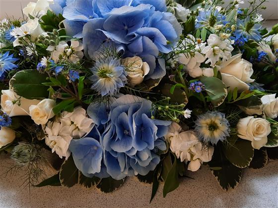 a mixed flower double ended spray in seasonal flowers in a mix of blue and white