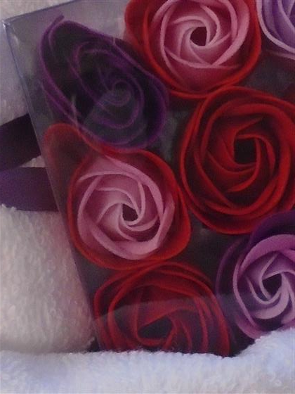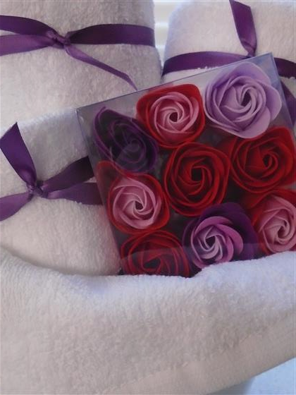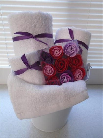 a beautiful gift of a white zinc pail filled with a bath towel, hand towel, 2 face cloth and soap flowers