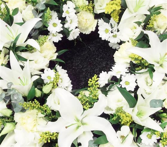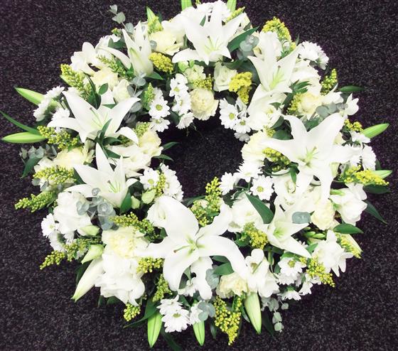 Subtle lemons and creams incorporating lilies and alstromeria combine with delicate solidaster to create this elegant wreath.