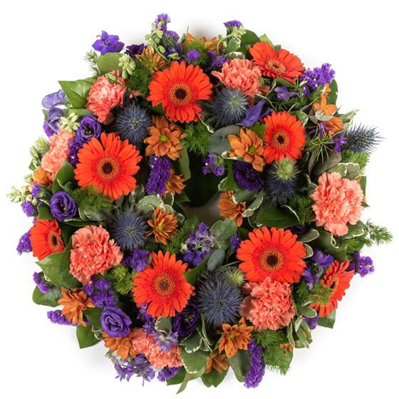 This traditional wreath combines thistles, statice, deep purple lisianthus, carnations and mini gerberas to create a beautiful tribute.