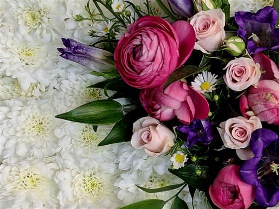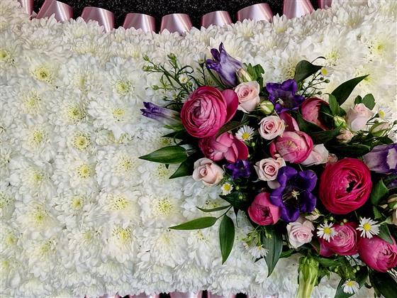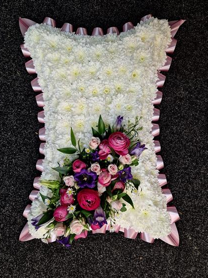 pillow tribute based in white chrysanthemum with ribbon edge and mixed flower spray. spray and ribbon available in other colours.