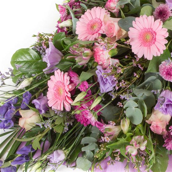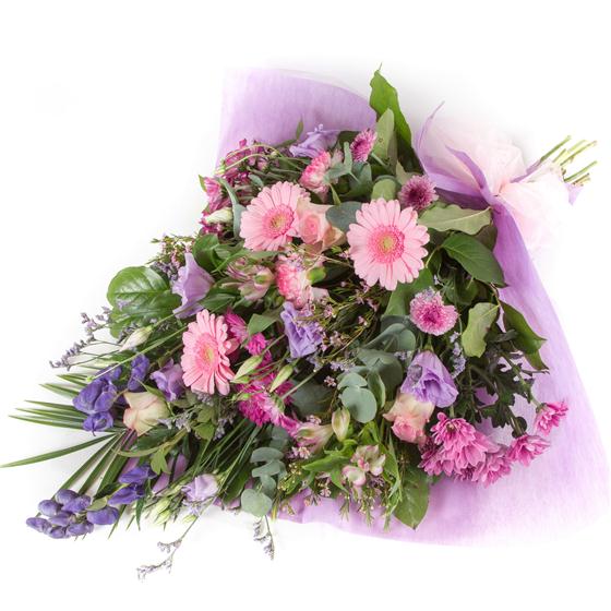 A pretty sheaf in lilacs and pinks including carnations, gerberas, wax flower and complementing foliage.
