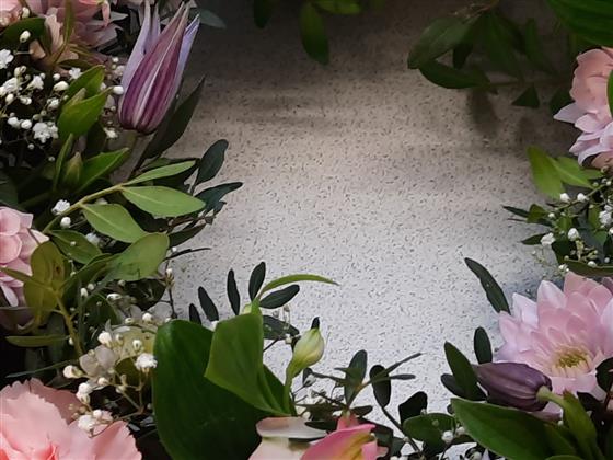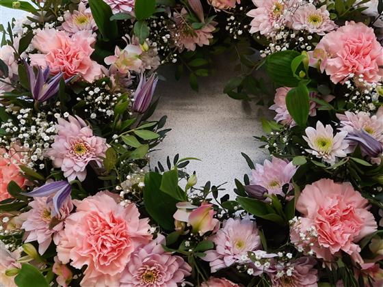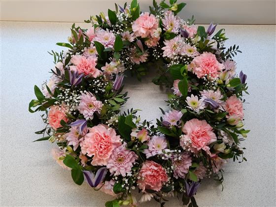 a lovely traditional wreath in a mix of pink seasonal flowers.