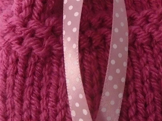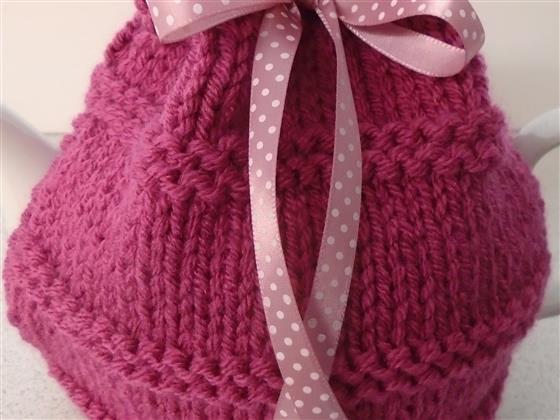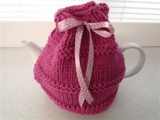 hand knitted tea cosy in a bag style with co-ordinating ribbon