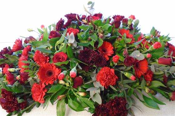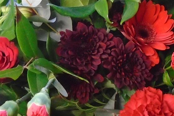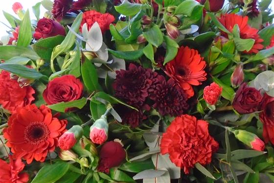 a beautiful spray of mixed flowers in all shades of red