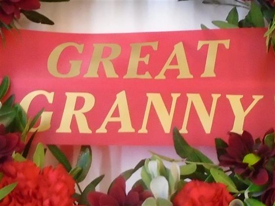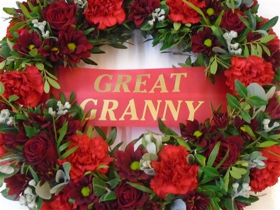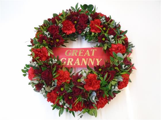 a mixed flower wreath with a ribbon with any name printed on it, available in a choice of colours.