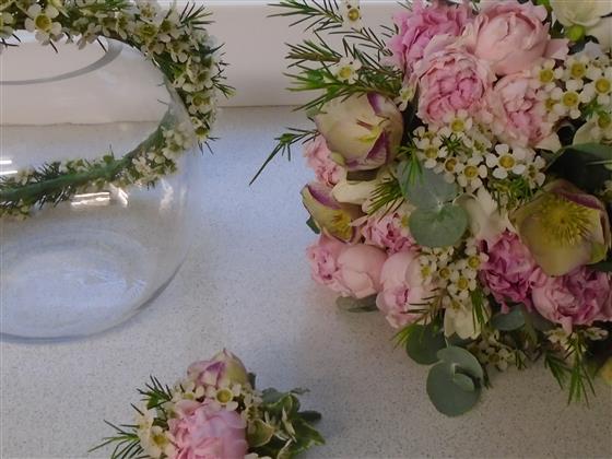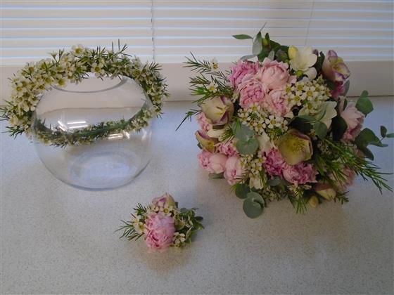 brides hand tied, buttonhole and matching flower crown in matching mixed flowers