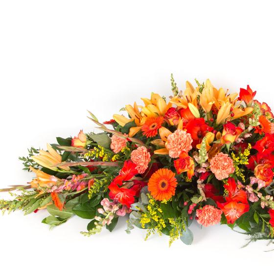 A lovely tribute of deep oranges and rusts including roses, lilies, mini gerberas, carnations and antirrhinum interspersed with golden solidago.