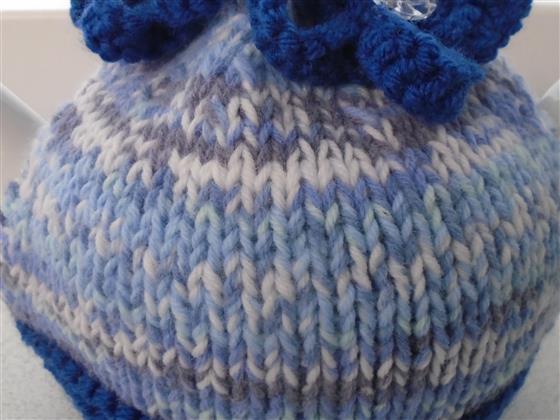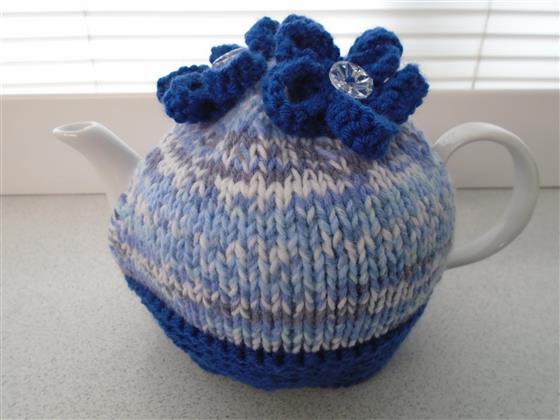 hand knitted tea cosy finished off with knitted flowers with co-ordinating buttons