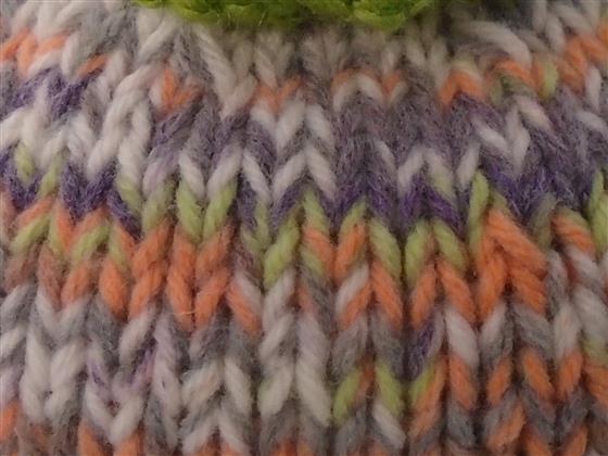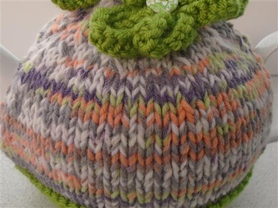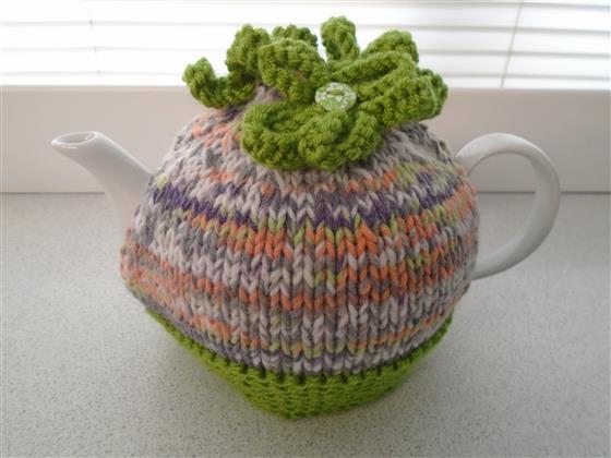 hand knitted tea cosy finished off with knitted flowers with co-ordinating buttons