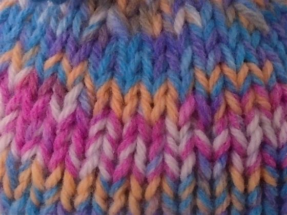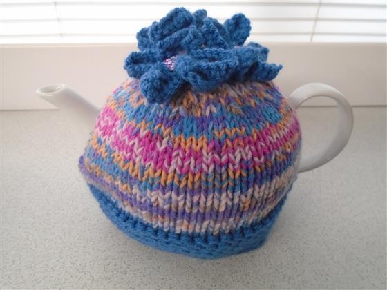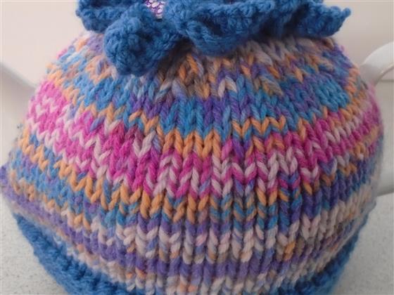hand knitted tea cosy finished off with knitted flowers with co-ordinating buttons
