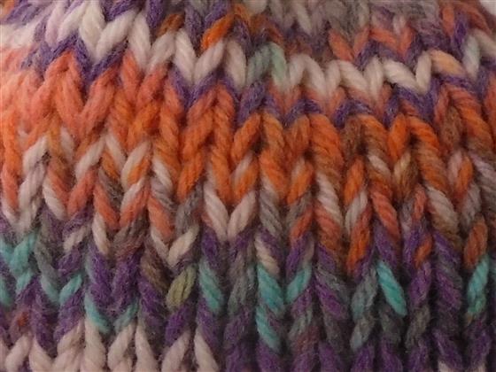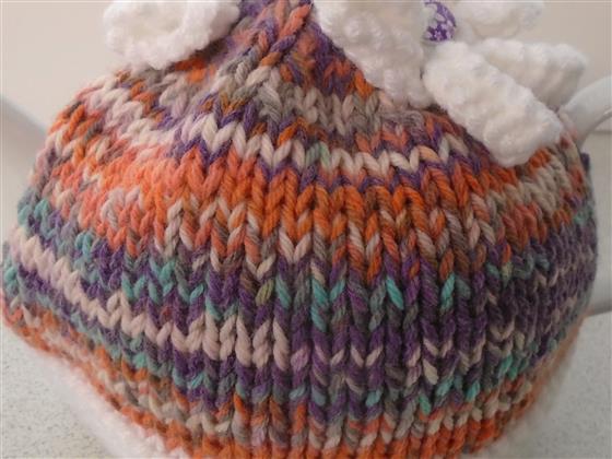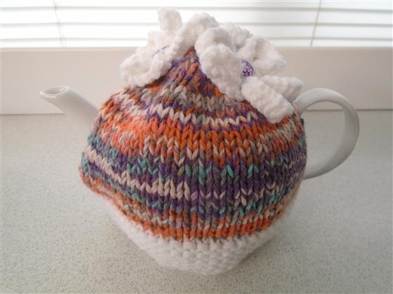 hand knitted tea cosy finished off with knitted flowers with co-ordinating buttons